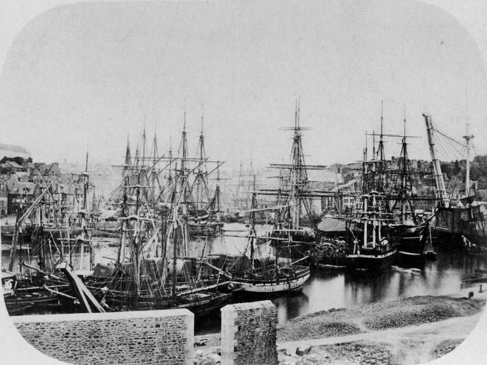 Vue de l'arsenal de Brest en 1859 : la Penfeld garnie de navires au niveau de la grue à mâter. Sur la droite, le bourg de RecouvranceImmatriculation