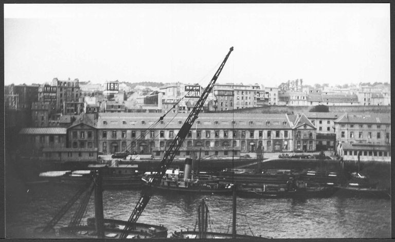 Vue de l'arsenal de Brest en 1890 : bâtiments logistiques, ici l'atelier de l'Artillerie. En arrière-plan : le quartier de Recouvrance. A gauche : le Pont NationalImmatriculation