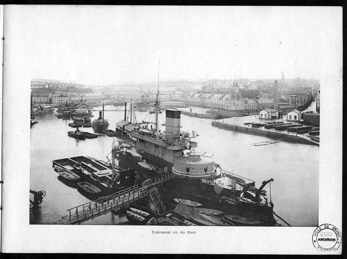 Vue générale de l'arsenal de Brest vers 1920 : la Penfeld, navires à quai ou au mouillage. A droite : le quai et les deux corps de garde de la porte TourvilleImmatriculation