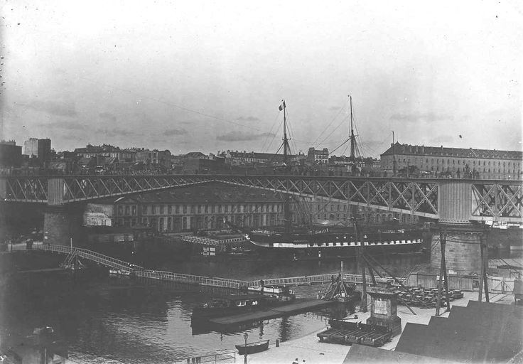 Vue générale de l'arsenal de Brest après 1861 (date d'achèvement du pont) : le pont tournant ou Pont National. Il est constitué de deux volées tournantes qui permettent aux bateaux à haute mâture de remonter la PenfeldImmatriculation