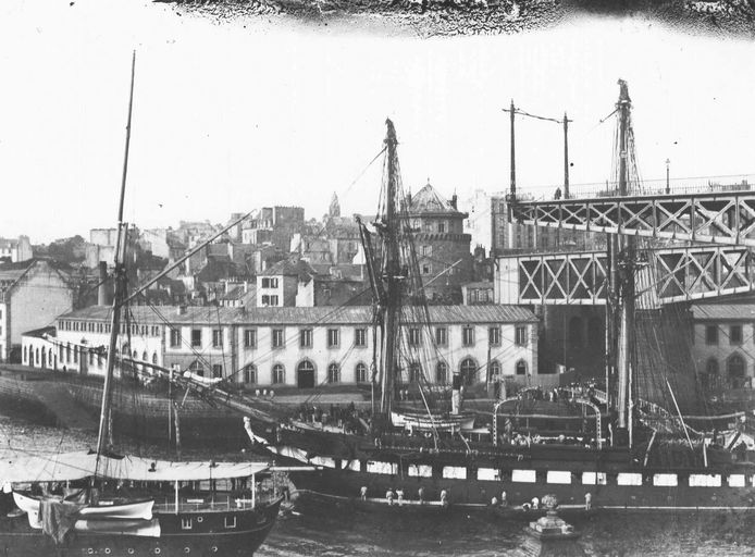 Vue de l'arsenal de Brest du côté de Recouvrance après 1861 (date d'achèvement du pont) : le pont tournant ou Pont National. Il est constitué de deux volées tournantes qui permettent aux bateaux à haute mâture de remonter la PenfeldImmatriculation