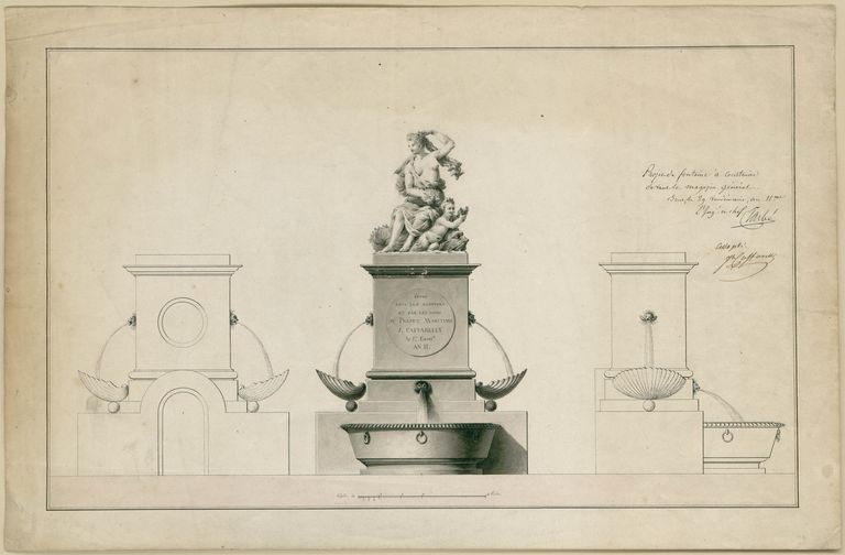 Esquisse du projet de la fontaine Caffarelli par Tarbé de Vauxclairs, architecte et ingénieur en chef de l'Arsenal de Brest à la demande du Préfet Maritime Caffarelli, 1801Immatriculation