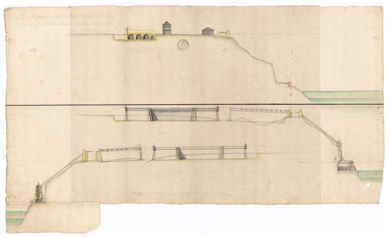 Collection Nivart. MS144_227. Batterie de Cornouaille. Développement, coupes et profils du fort projeté sur la hauteur de la batterie de Cornouaille à l´entrée du Goulet de Brest. 1684 (?). Plan, support papier, 0,730 x 0,388 mètre, 4e quart 17e siècle, 1684 (?).