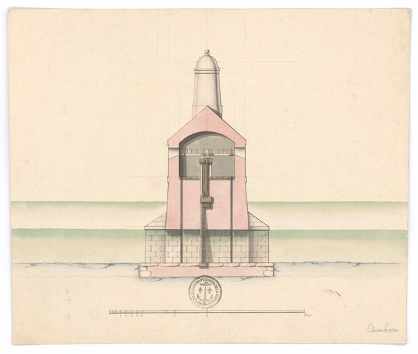 Collection Nivart. MS144_227. Batterie de Cornouaille. Coupe d'une des trois portes d'écluse destinée à l'alimentation d'un fossé en eau. 1684 (?). Plan, support papier, 0,283 x 0,285 mètre, 4e quart 17e siècle, 1684 (?).