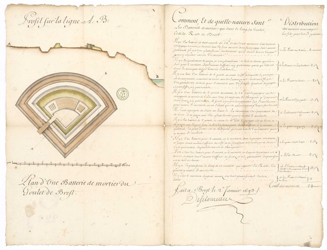 Collection Nivart. MS144_226. Plan d'une batterie de mortier du Goulet de Brest, avec un état des batteries de mortier qui défendent cette rade. Sign. Desclouzeaux. 2 janvier 1693.Plan, support papier, 0,608 x 0,456 mètre, 4e quart 17e siècle, 2 janvier 1693.