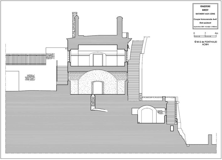 Coupe transversale A-A', état existant, septembre 2007 (extrait de l'étude préalable à la restauration de Marie-Suzanne de Ponthaud, Architecte en Chef des Monuments Historiques)Immatriculation