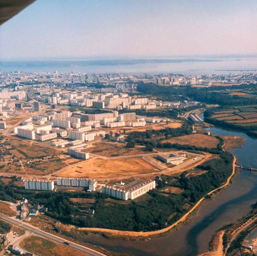 Vue aérienne oblique de Brest en 1975 : la Penfeld au Moulin de Talarn, l'emplacement du futur quartier de Quizac, Kerhallet. En arrière-plan : le quartier de Bellevue. A signaler : piquets d'immersion des bois mouillés dans la PenfeldImmatriculation