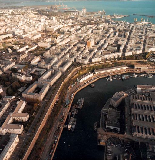 Vue aérienne oblique de Brest en 1984 : la Penfeld, l'arsenal, le plateau des Capucins (rive droite), le boulevard Jean Moulin, la ville (rive gauche). En arrière-plan : le port de commerce, Poullic Al LorImmatriculation