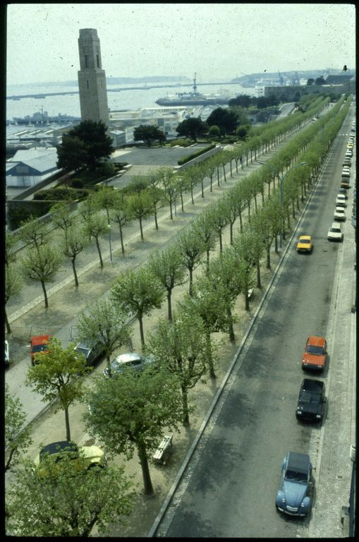 Vue d'ensemble de la promenade du Cours Dajot et du Monument Américain à Brest en 1985. A l'arrière plan : la rade et le goulet de BrestImmatriculation