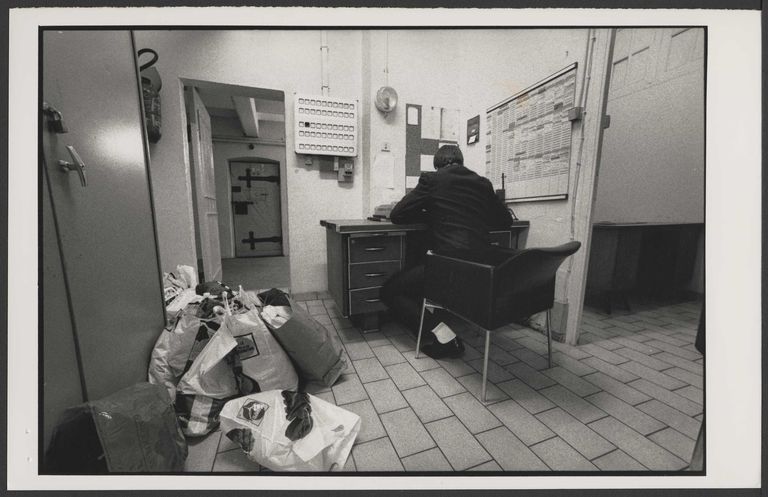 La prison de Pontaniou par Bruno Ravalard, 1989 : le local des gardiens, gardien photographié de dos à son bureau. Sur le mur sont accrochés circulaires et tableau planning à fiches ; au sol, du carrelage