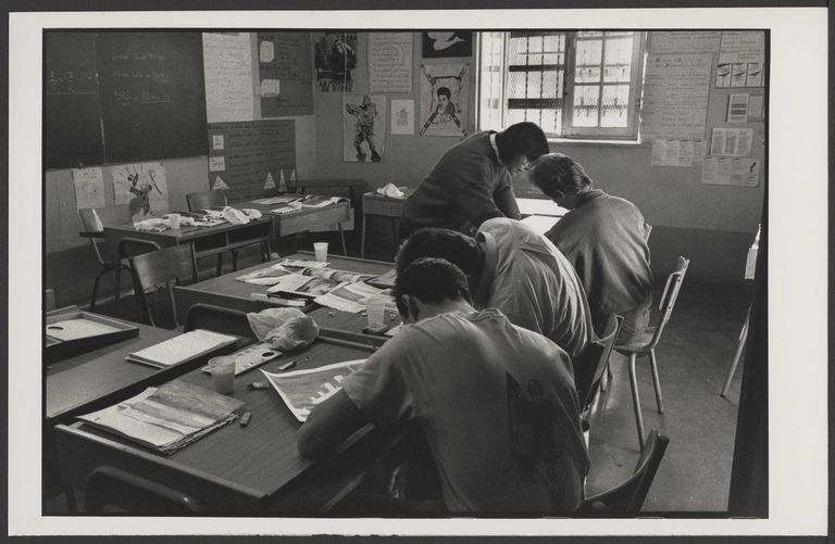 La prison de Pontaniou par Bruno Ravalard, 1989 : l'atelier peinture, trois détenus photographiés de dos avec leur enseignanteImmatriculation