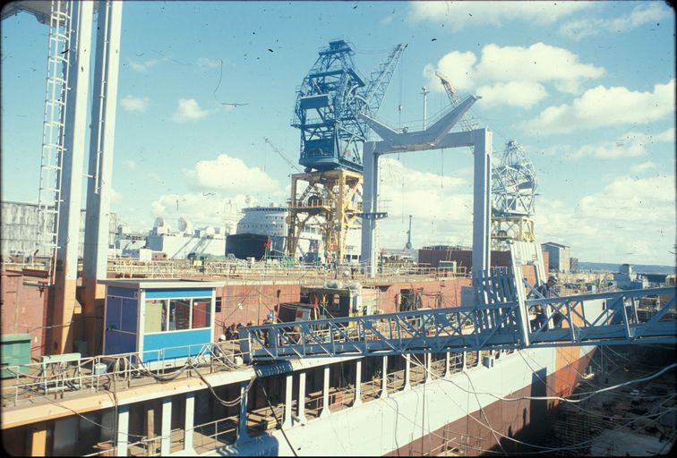 Vue de l'arsenal de Brest en 1980 : formes de construction, bassins de radoub de Laninon dits bassins de Laninon (n° 8 et 9). Pétrolier ravitailleur en constructionImmatriculation