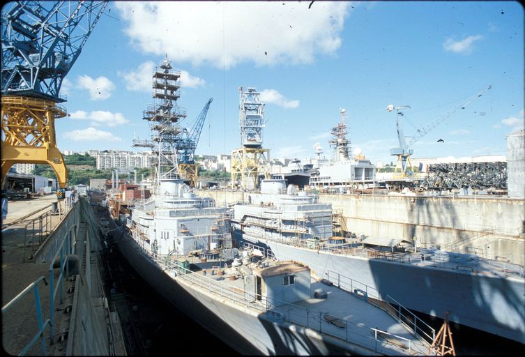 Vue de l'arsenal de Brest en 1980 : formes de construction, bassins de radoub de Laninon dits bassins de Laninon (n° 8 et 9). Deux navires militaires en cale sècheImmatriculation