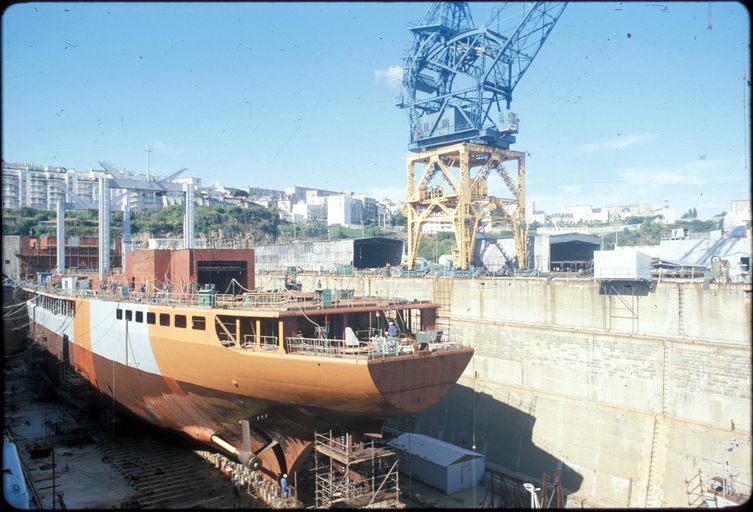 Vue de l'arsenal de Brest en 1980 : formes de construction, bassins de radoub de Laninon dits bassins de Laninon (n° 8 et 9). Pétrolier ravitailleur en constructionImmatriculation