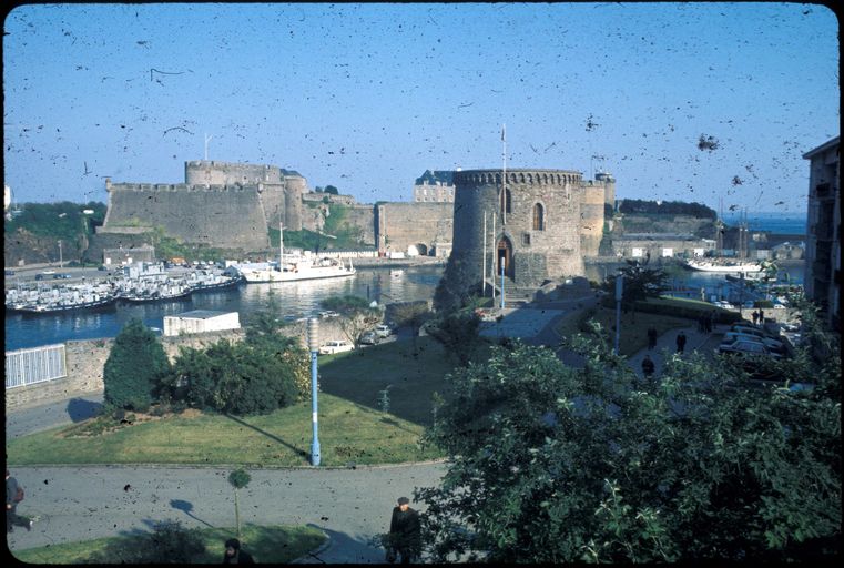 Vue de l'arsenal de Brest en Penfeld vers 1980 : la tour Tanguy avant la restauration de la couverture en poivrièreImmatriculation