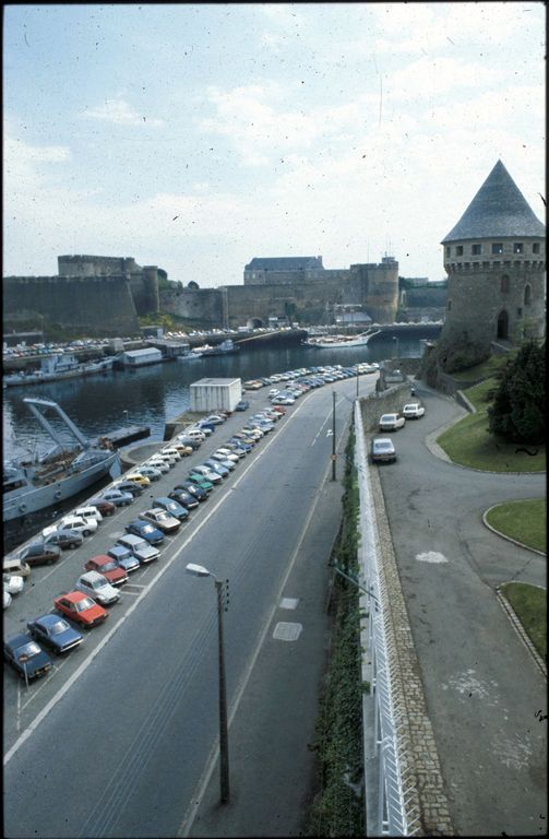 Vue de l'arsenal de Brest en Penfeld vers 1980 : la tour Tanguy après la restauration de la couverture en poivrièreImmatriculation
