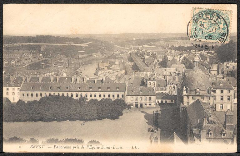 Vue générale de la ville depuis le sommet de l'église Saint-Louis : le Séminaire, la Penfeld et l'arsenal en arrière-plan. Carte postaleImmatriculation
