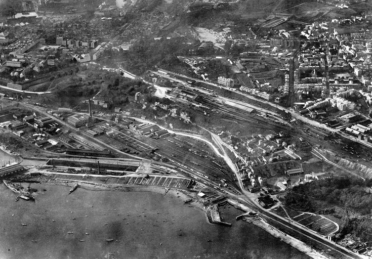 Vue aérienne oblique de Brest en 1926 : la gare de chemin de fer, Poulic al Lor, le portImmatriculation