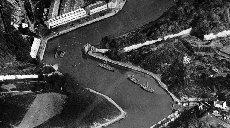 Vue aérienne oblique de Brest en 1926 : la Penfeld au niveau des portes de l'arrière-garde et de Quéliverzan. A signaler : les retouches de l'image pour vider la Penfeld de ses bateaux de guerre (secret défense)Immatriculation