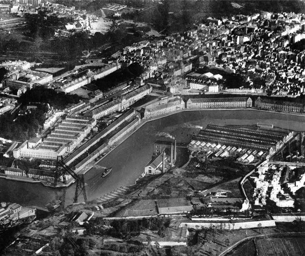 Vue aérienne oblique de Brest en 1926 : la Penfeld, l'arsenal, les fortifications, l'hôpital maritime, le bagne, la caserne de l'Infanterie Coloniale (rive gauche) et les ateliers du plateau des Capucins (rive droite)Immatriculation