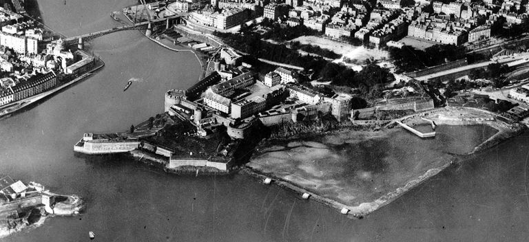 Vue aérienne oblique de Brest en 1926 : l'embouchure de la Penfeld, le château, les fortifications et le pont tournantImmatriculation