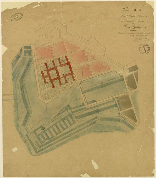 Projet de réunion de l'hôpital et de l'hospice à Brest, avant-projet : plan d'ensemble, fait à Brest le 19 novembre 1867 par Edouard Deperthes, architecte de la villeImmatriculation