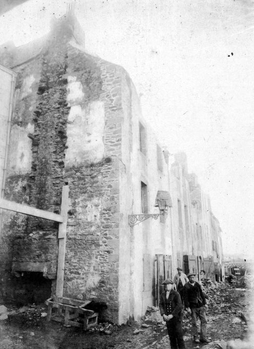 Vue du quartier des Sept-Saints à Brest vers 1895 : maison en cours de démolition. Au premier plan : lanterne de l'éclairage public brestoisImmatriculation