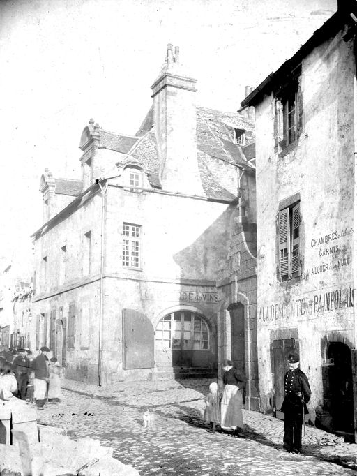 Vue du quartier des Sept-Saints à Brest en 1895 : maison au 31 rue Monge acquise par la ville en 1880, détruit en 1897 (propriété Le Moal). Rue neuve des Sept-Saints, entrée de l'école des Frères. Poste de Police. Hôtel garniImmatriculation