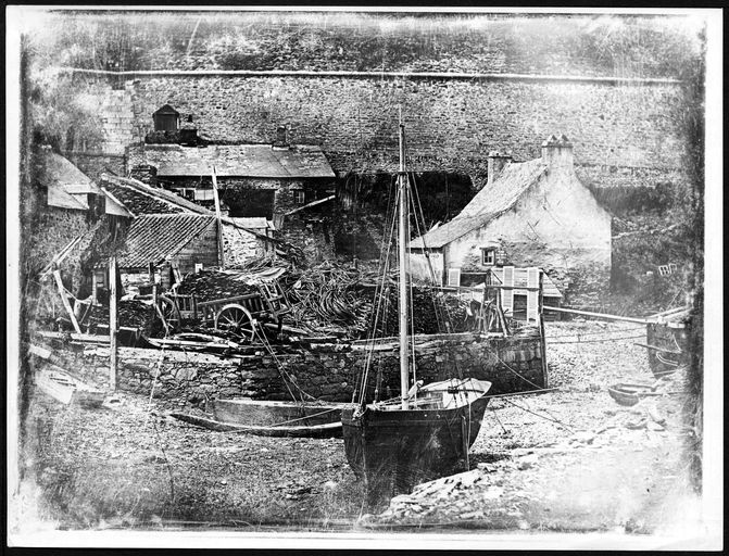Vue du pied du château de Brest vers 1848 : maisons en mauvais état, port et grève, bâteau de pêche. En arrière-plan : fortification et cordonImmatriculation