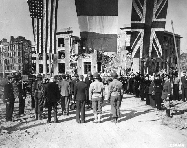 Vue de la cérémonie de remise des clés de la ville par le général américain Troy Houston Middleton au maire Jules Lullien en présence des autorités communales françaises, 20 septembre 1944Immatriculation