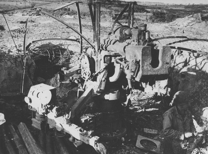 Vue d'un canon antiaérien allemand détruit par l'artillerie américaine, septembre 1944 (U.S. Army Signal Corps)Immatriculation