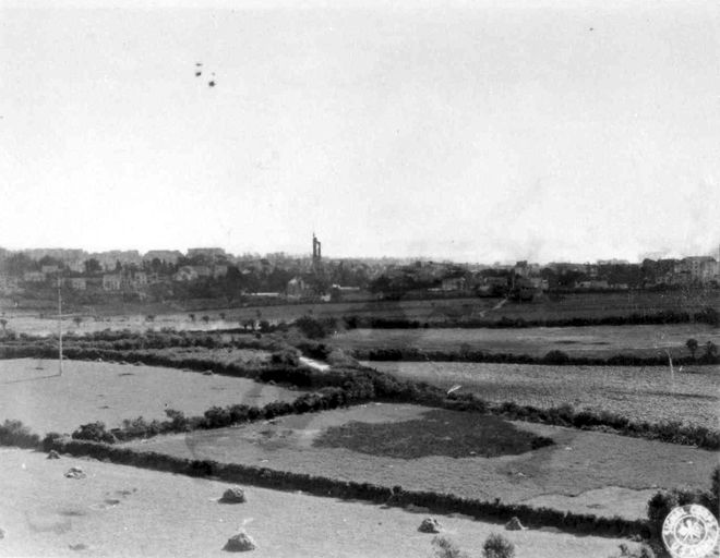 Vue de la festung Brest pendant la bataille de Brest, U.S. Army Signal Corps, septembre 1944 : vue aérienne oblique non localisée, en arrière-plan, la ville partiellement détruiteImmatriculation