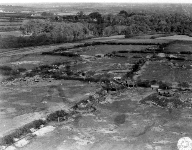 Vue de la festung Brest pendant la bataille de Brest, U.S. Army Signal Corps, septembre 1944 : vue aérienne oblique de la batterie antiaérienne codée M.K.B. Zwischendeck (4 canons de 10,5 cm ; 2 canons de 2 cm) (B 413 / 2 / Ma Fla 803)Immatriculation