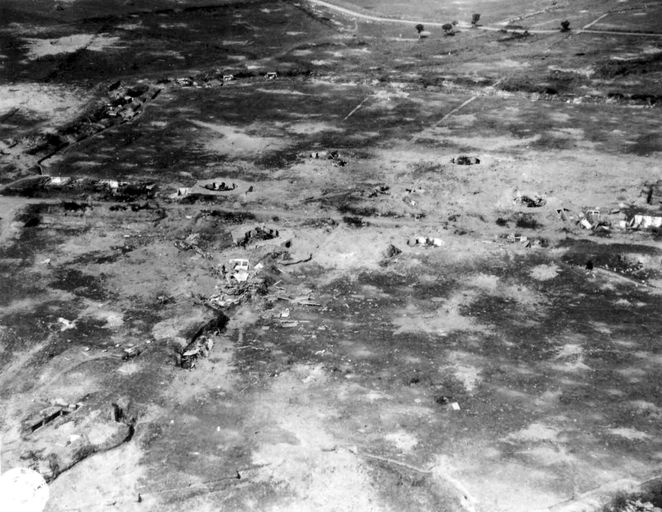 Vue de la festung Brest pendant la bataille de Brest, U.S. Army Signal Corps, septembre 1944 : vue aérienne oblique de la batterie antiaérienne codée M.K.B. Zellwolle (4 canons de 10,5 cm ; 2 canons de 2 cm) (2 / Ma Fla 805)Immatriculation