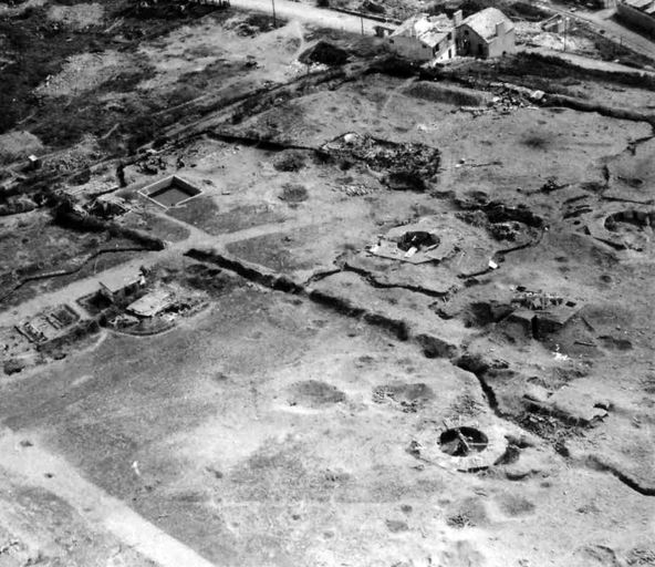 Vue de la festung Brest pendant la bataille de Brest, U.S. Army Signal Corps, septembre 1944 : vue aérienne oblique de la batterie antiaérienne codée M.K.B. Dingi (4 canons de 10,5 cm ; 2 canons de 2 cm) (3 / Ma Fla 803)Immatriculation