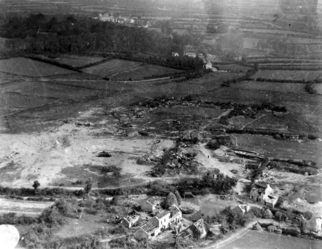 Vue de la festung Brest pendant la bataille de Brest, U.S. Army Signal Corps, septembre 1944 : vue aérienne oblique du point fort (92-05) situé au nord-est de Brest (Kergonan : ?)Immatriculation