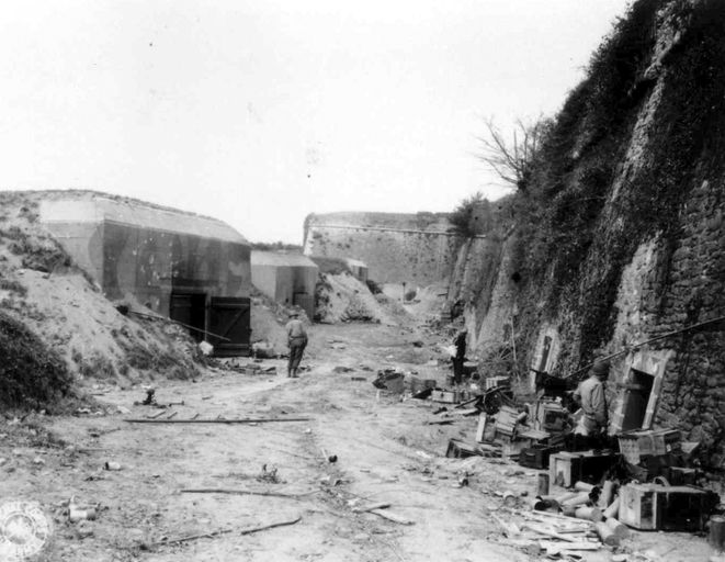 Vue de la festung Brest pendant la bataille de Brest, U.S. Army Signal Corps, septembre 1944 : arrière de la batterie de Quéliverzan (4 canons de 10,5 cm de type le.F.H. 325 (f) sous casemate de type 669) (B 18) (1/ H.A.A. 1162)Immatriculation