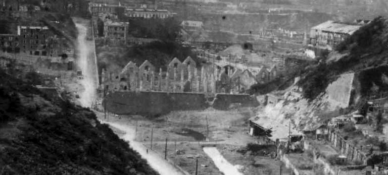 Vue de la festung Brest pendant la bataille de Brest, U.S. Army Signal Corps, septembre 1944 : vue d'ensemble de la porte du Moulin à Poudre (aujour'hui porte de la Brasserie). Mur défensif percé de créneaux de mousquetterie de la porteImmatriculation