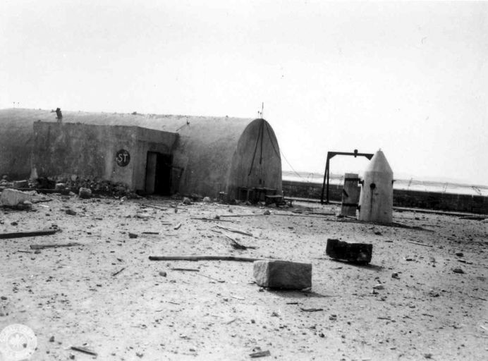 Vue de la festung Brest pendant la bataille de Brest, U.S. Army Signal Corps, septembre 1944 : abris et guérite en béton du Port de Commerce. Marquage allemand St pour Ständig : occupation permanenteImmatriculation