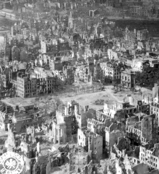 Vue de la festung Brest pendant la bataille de Brest, U.S. Army Signal Corps, septembre 1944 : vue aérienne oblique de la ville dévastéeImmatriculation