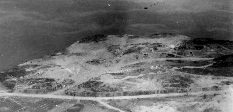 Vue de la festung Brest pendant la bataille de Brest, U.S. Army Signal Corps, septembre 1944 : vue aérienne oblique de la batterie haute de la Pointe Robert à RoscanvelImmatriculation