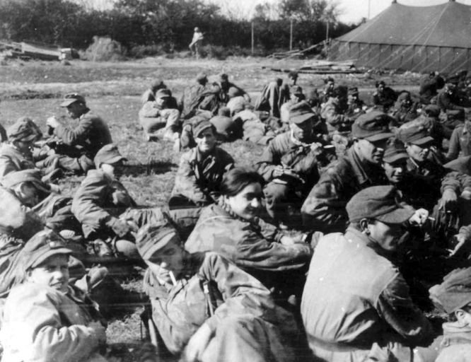 Vue de la festung Brest pendant la bataille de Brest, U.S. Army Signal Corps, septembre 1944 : camp temporaire de prisonniers allemandsImmatriculation