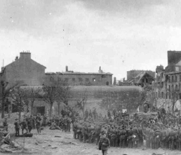Vue de la festung Brest pendant la bataille de Brest, U.S. Army Signal Corps, septembre 1944 : rassemblement de prisonniers allemands faits par les soldats américains place Wilson. Le blockhaus sert aujourd'hui à la Banque de FranceImmatriculation