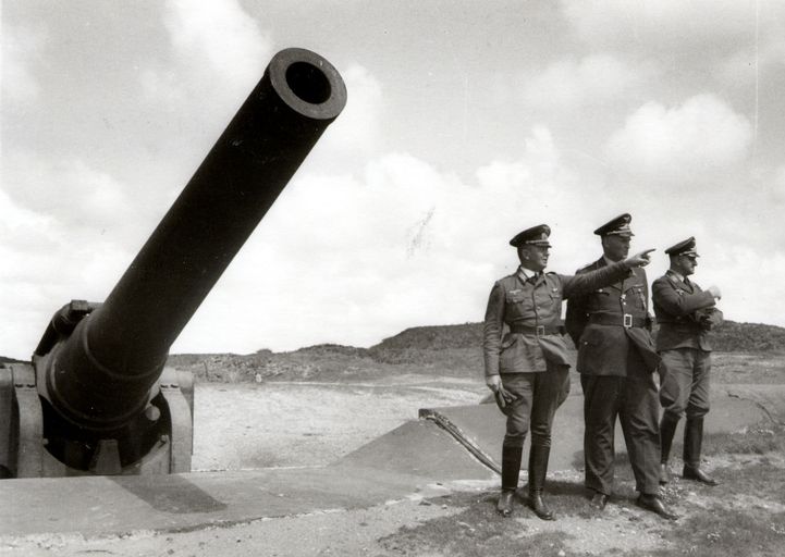 Vue d'un des quatre anciens canons français de 240 mm Guerre de la batterie de Toulbroc'h, inspection de l'Etat-major allemand en 1940 ou 1941Immatriculation