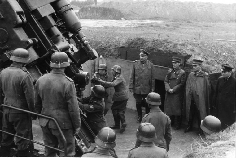 Vue de l'un des canons de la batterie antiaérienne baptisée Vulkan pendant la Seconde Guerre Mondiale : exercice de tir en présence d'autorités allemandes et japonaisesImmatriculation
