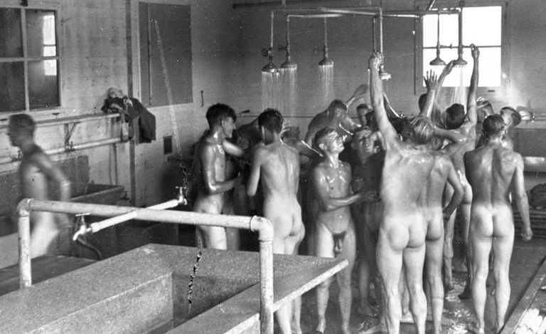 Vue de la vie quotidienne de la garnison de la batterie Graf Spee : soldats sour la douche, novembre 1941 ? (image de propagande de l'Allemagne nazie)Immatriculation