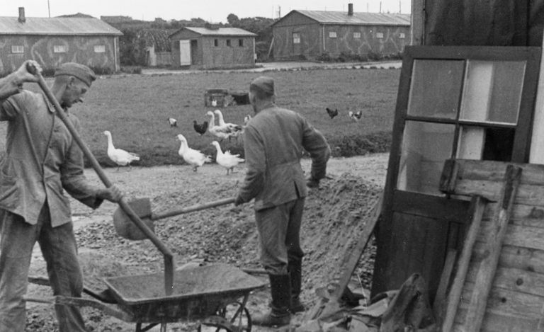 Vue de la vie quotidienne de la garnison de la batterie Graf Spee : soldats au travail dans la basse-cour, novembre 1941 ? (image de propagande). En arrière-plan, les barraquementsImmatriculation