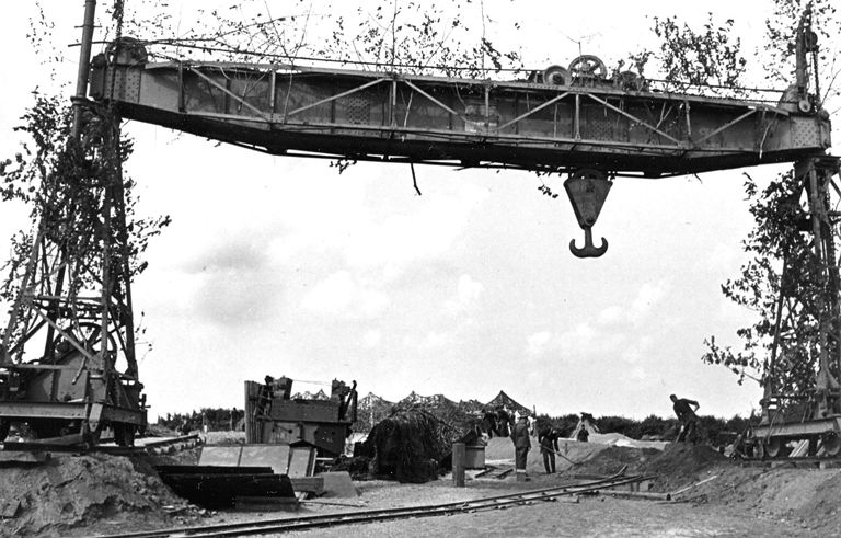 Vue du chantier de la batterie Graf Spee : portique sur rail avec treuil permettant la manutention des pièces, 29 novembre 1940. Le portique est sommairement camoufflé par des branchagesImmatriculation