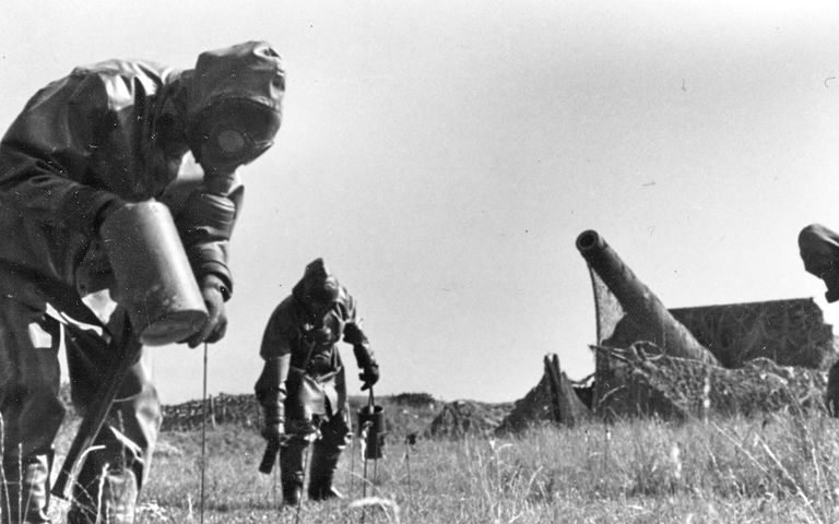 Vue de la vie quotidienne de la garnison de la batterie Graf Spee : soldats en tenue simulant une attaque au gaz (image de propagande). A l'arrière-plan, l'un des canons de 28 cmImmatriculation