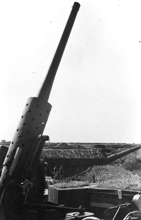 Vue de l'un des canons destinés à la défense antiaérienne de la batterie Graf Spee. En arrière-plan, l'un des canons de 28 cm de la batterie Graf SpeeImmatriculation